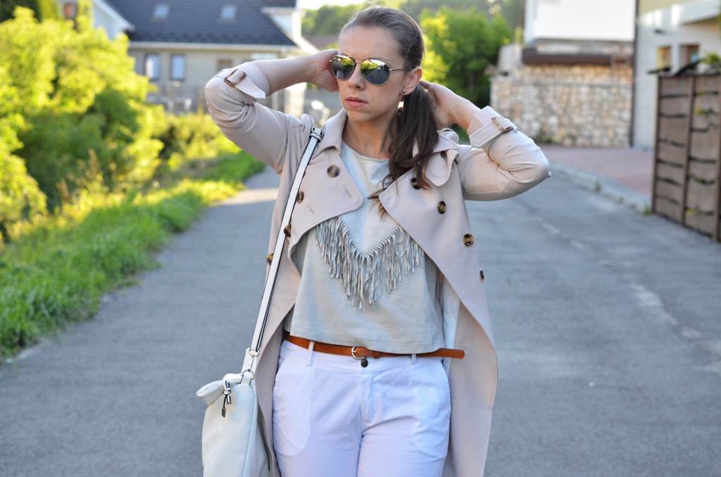 W dzisiejszym poście przedstawiam Wam połączenie. Frędzle, które są strasznie popularne w tym sezonie oraz trencz, który jest moim zdaniem nieodzownym elementem w każdej garderobie. Z racji tego, że pogoda płata nam figle i raz jest ciepło raz zimno to stwierdziłam, że trencz, który zazwyczaj używany był przeze mnie w okresie jesiennym albo wiosennym tym razem sprawdził się również w okresie letnim.