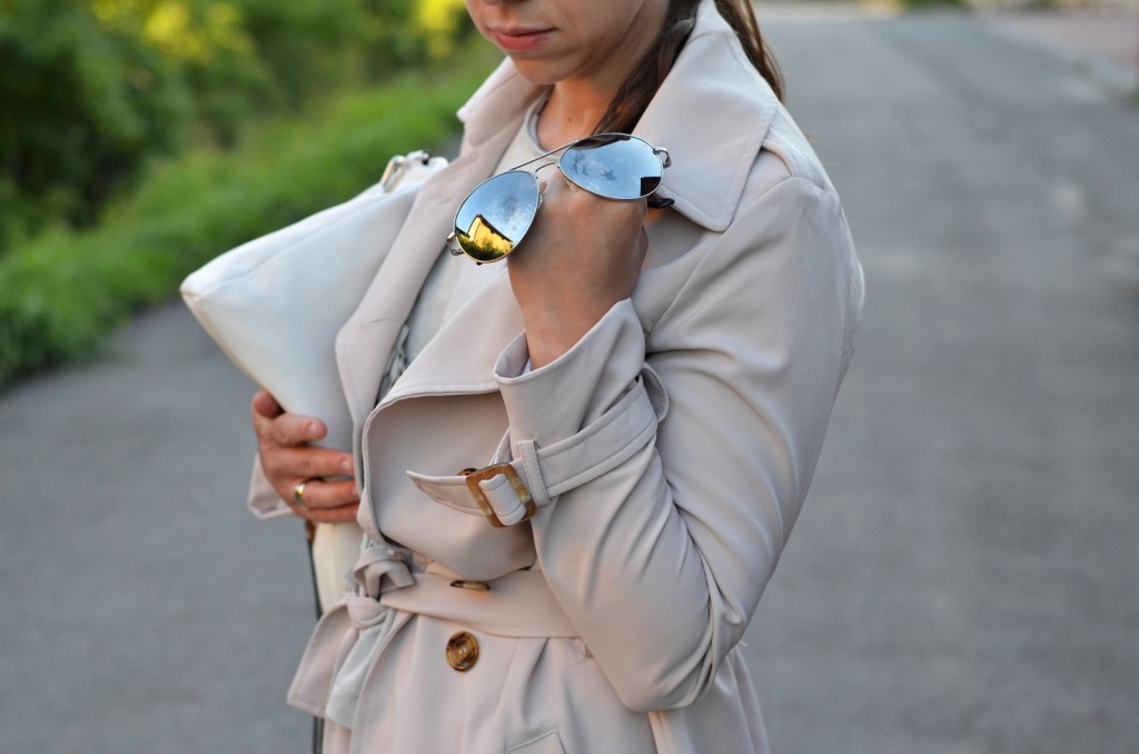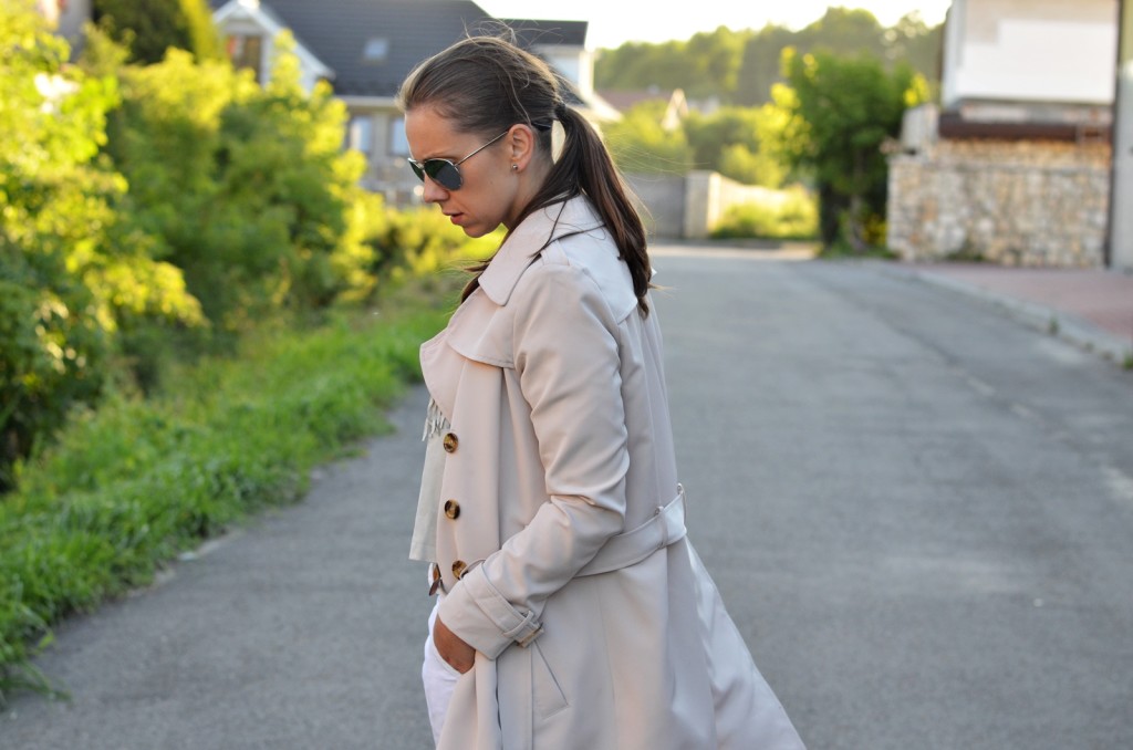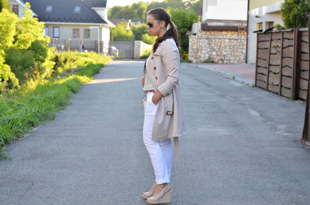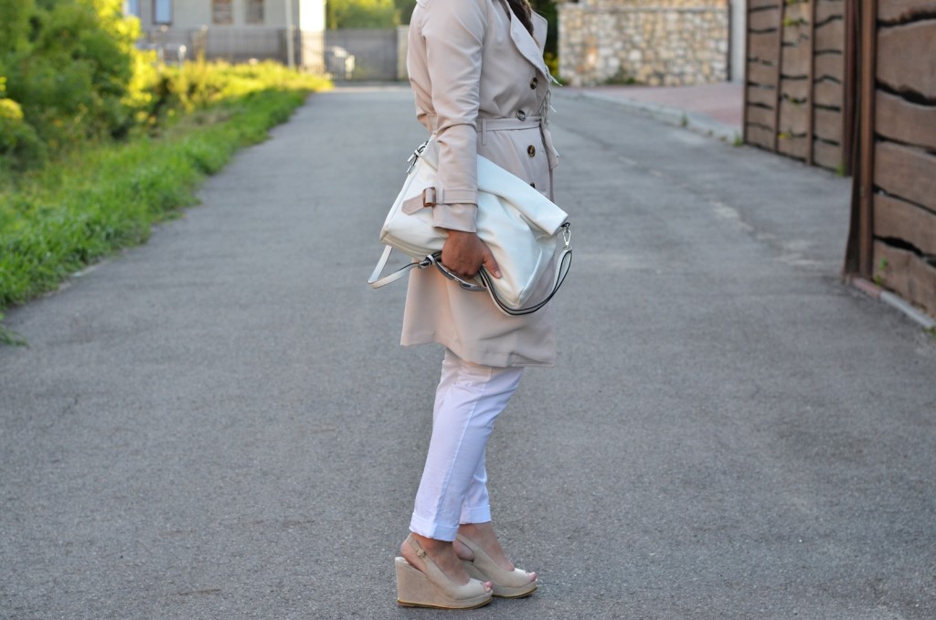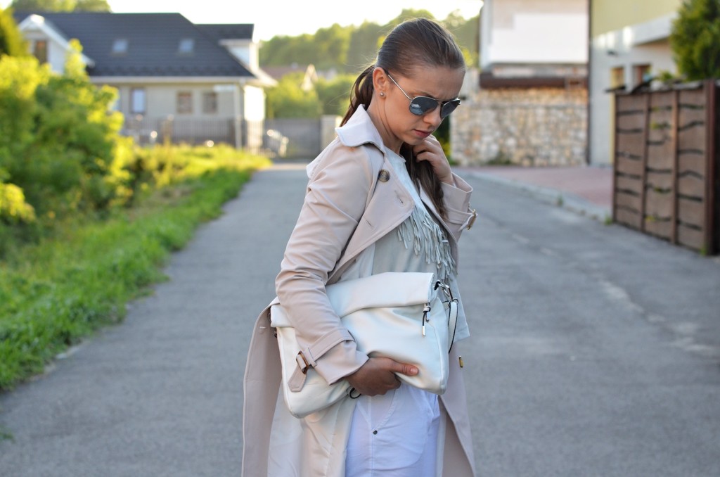 W stylizacji, którą widzicie, uwagę również przykuwają białe spodnie. Jednym mogą się one podobać, a innym wręcz przeciwnie. Ja do jakiegoś czasu nawet nie myślałam o tym, żeby takowe spodnie założyć powód?? Oczywiście kompleksy. Mimo że mojej figurze jeszcze sporo brakuje do ideału, to jednak mimo wszystko postanowiłam zaryzykować i je założyć. Jak wspomniałam powyżej, jasny trencz idealnie współgra w zestawie z białymi spodniami. Myślę, że również świetnie pasowałyby jasne jeansy. Dajcie znać w komentarzach, co sądzicie o takim zestawieniu ?? Czy uważacie, że białe spodnie pasują tylko i wyłącznie bardzo szczupłym i zgrabnym kobietom? Chętnie poczytam, co na ten temat sądzicie.