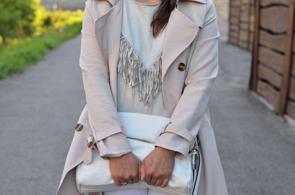 BLUZKA W FRĘDZLE I JASNY TRENCZ