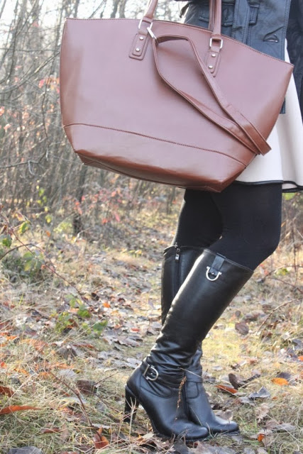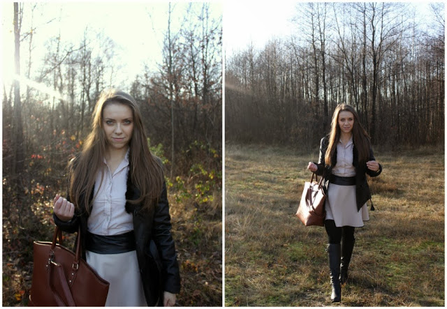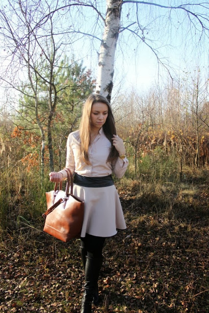 Do spódnicy dobrałam koszulę w podobnym kolorze a całość uzupełniłam czarnymi kozakami . Na wierzch założyłam czarną kurtkę z eco skóry,oraz jako dodatek dobrałam dużą torbą w kolorze brązu obie te rzeczy znajdowały się na mojej liście życzeń, którą możecie zobaczyć TU . Postanowiłam , że się na nie skuszę w tym miesiącu :)