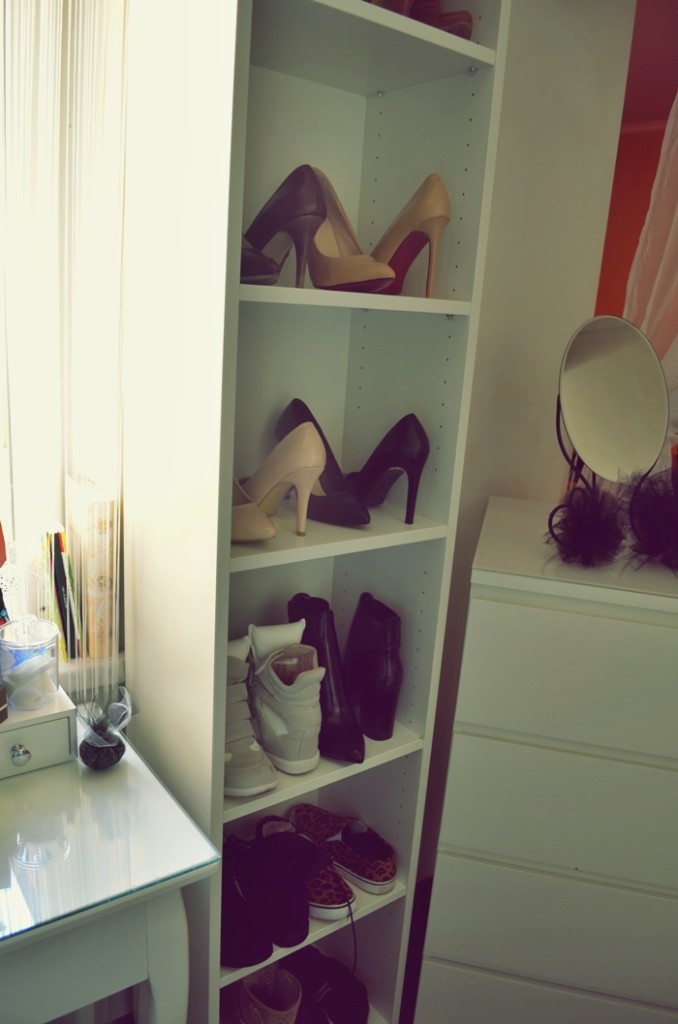 Na regale obok toaletki znajdują się buty , które zakładam najczęściej lub te , które najbardziej cieszą moje oko ;) reszta natomiast pochowana jest po części w pudełkach a inna część w szafie specjalnie do tego przystosowanej. Kocham buty i ciągle je kupuję ;) mogę posiadać jeden fason w kilku kolorach , ale staram się ograniczać i rozsądnie wydawać na nie pieniądze.