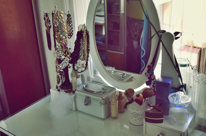 Biała toaletka to prezent , który otrzymałam jakiś rok temu od mojego męża zanim byliśmy jeszcze narzeczeństwem :D w szufladzie oraz na toaletce trzymam najpotrzebniejsze rzeczy do makijażu a także kolejną część biżuterii.