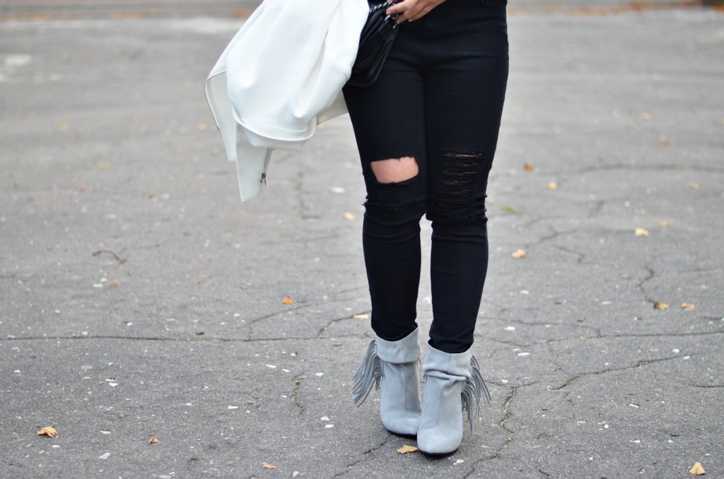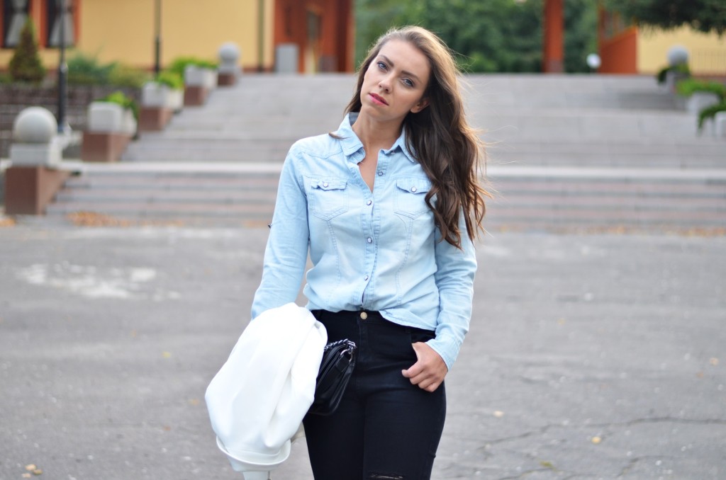 Gdy po raz pierwszy zobaczyłam te szare skórzane botki na koturnie, od razu wiedziałam, że muszę je mieć. Pięknie się prezentują na nodze a dzięki koturnie optycznie wydłużają nogi. Dodatkowo super wrażenie sprawiają te frędzle z boku buta. Dodają takiego fajnego efektu. Zestawiłam je z czarnymi spodniami z dziurami i białą narzutką, która również może służyć jako sukienka. Jako dopełnienie dobrałam czarną torebkę na grubszym łańcuszku i dla przełamania wszystkiego jasną dżinsową koszulę. Myślę, że ta koszula fajnie kontrastuje zarówno z czarnymi spodniami, jak i z dżinsową koszulą.