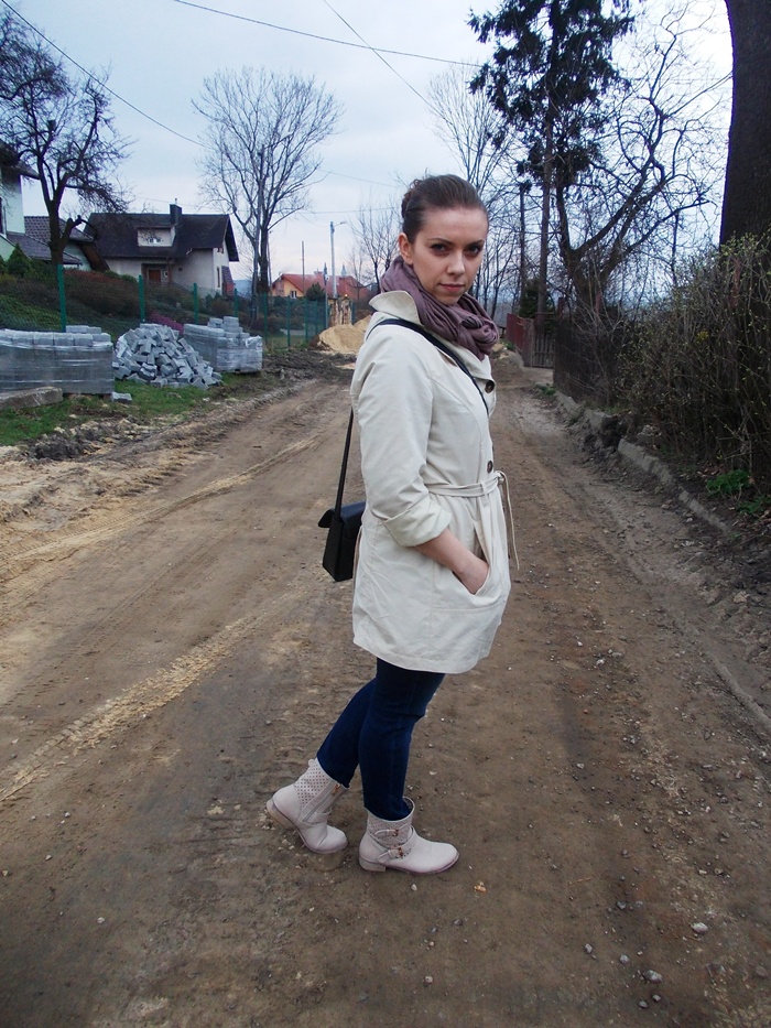W dzisiejszym secie prezentuję jasny trencz , który zestawiłam z botkami w bardzo zbliżonym kolorze.