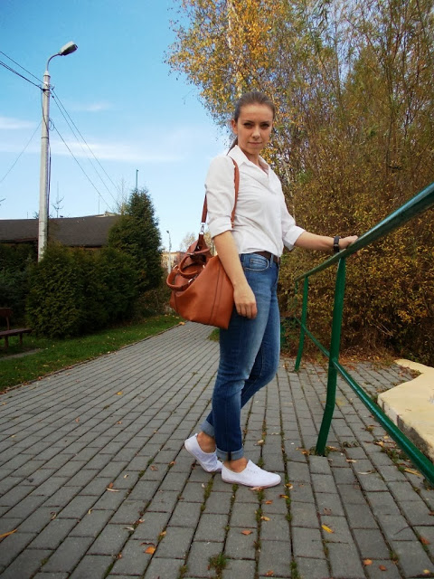 Zestaw bardzo mi się spodobał. Niby połączenie banalne, bo biała koszula + jeansy, ale jednak cos w sobie ma:)
