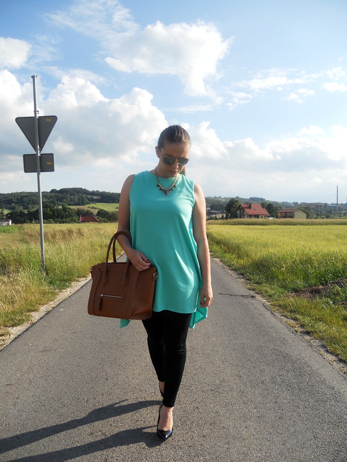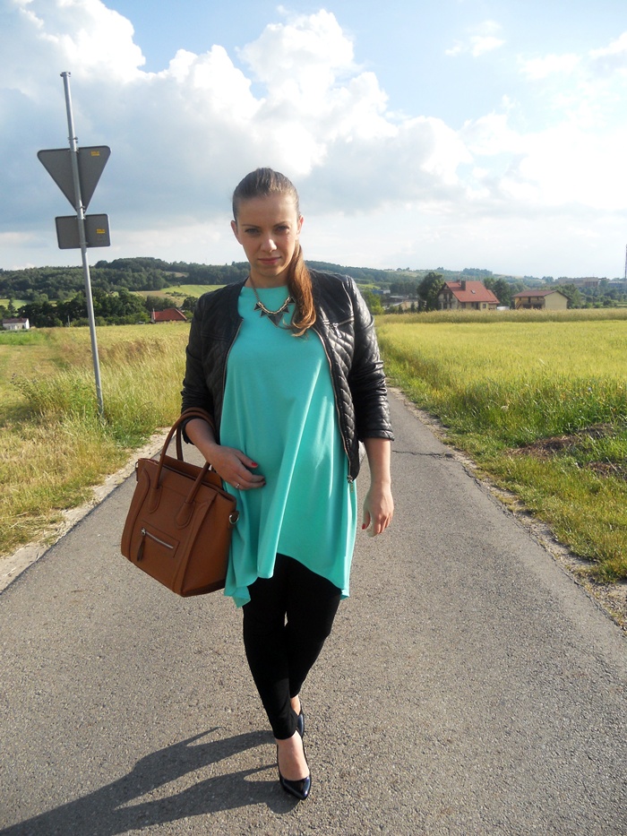 Tunika świetnie prezentuje się z czarnymi dodatkami ale odrzuciłabym tą torebkę bo kompletnie tutaj nie pasuje :)